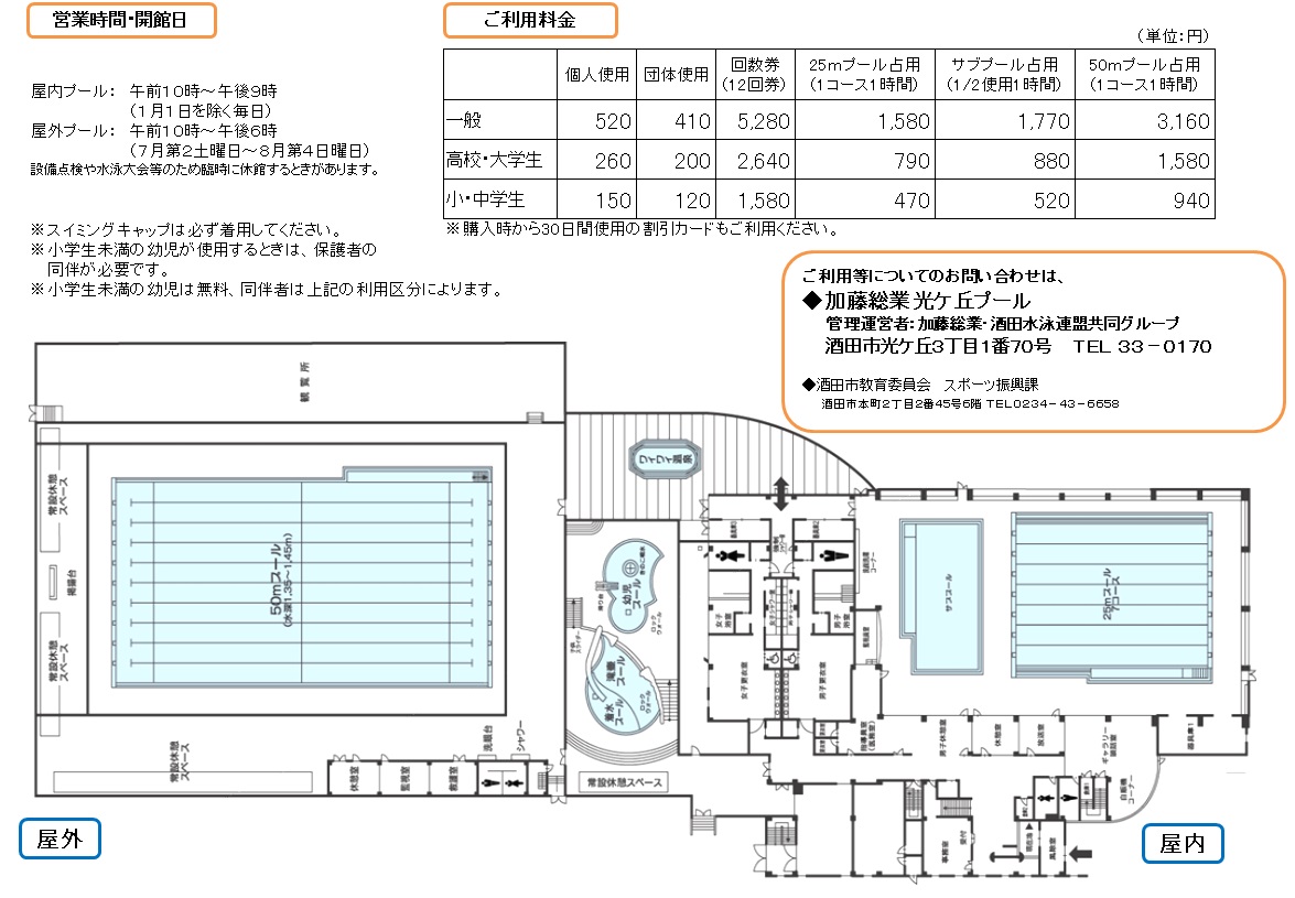 屋外プール:午前10時〜午後6時(7月第2土曜日〜8月第4日曜日)